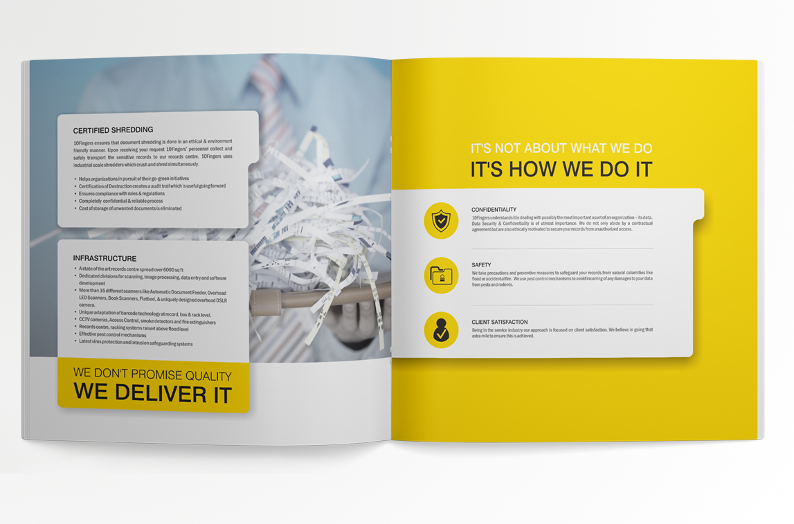 10Fingers Records Management Services is a dynamic organization specializing in records consultation, safe storage, digitization, certified shredding & data entry. Purple Phase Communications was approached by the client for writing & designing their corporate brochure. We had an interactive session with client to understand their business, which was followed by product and competition research at length. Insights derived from the research helped us in developing content and design. To mark a distinction, we created a die-cut design on title page of the brochure, which cleverly communicated their business